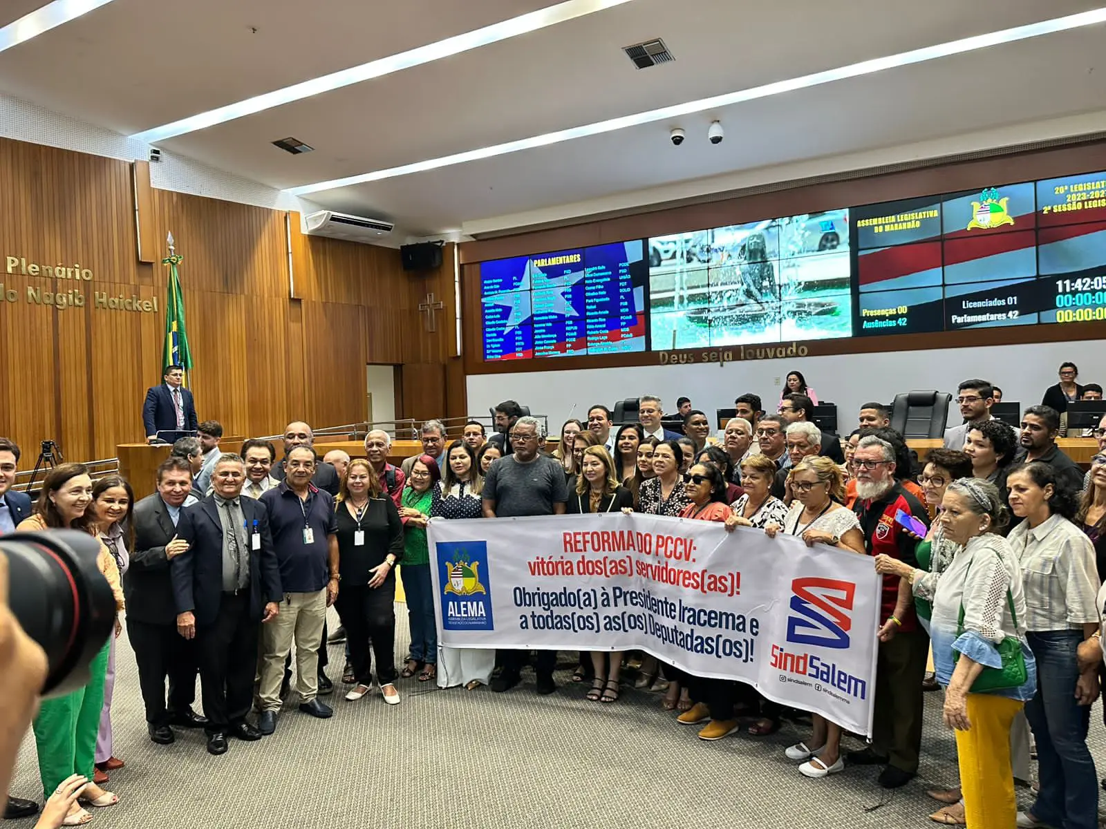 A Assembleia Legislativa do Maranhão (Alema) aprovou, na sessão desta terça-feira (3), o novo Plano de Cargos, Carreiras e Vencimentos (PCCV) dos servidores efetivos do Legislativo estadual, uma demanda antiga, atendida na gestão da presidente Iracema Vale (PSB). Com faixas de agradecimento à chefe do Parlamento e aos deputados, os funcionários assistiram à sessão e aplaudiram muito a aprovação do Projeto de Lei nº 494/2024, que segue para a sanção do governador Carlos Brandão (PSB).