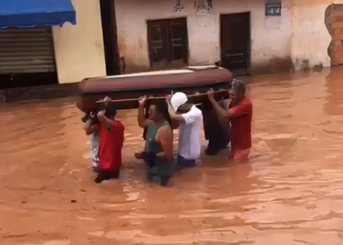 Em meio a situação de calamidade, um caixão com uma pessoa morta, foi transportado por moradores, em meio a enchente no centro do município. Um animal também foi arrastado pela correnteza.