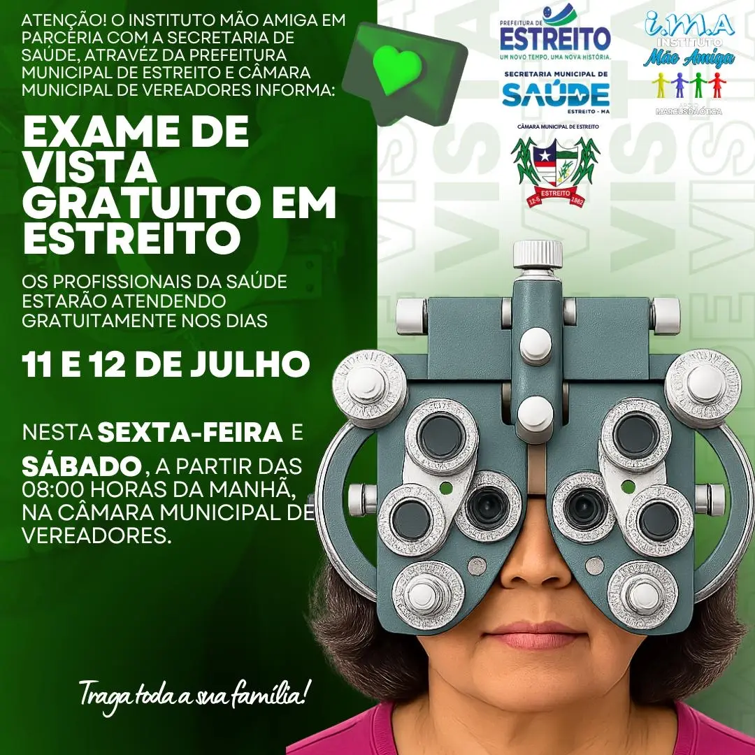 A população de Estreito (MA) terá a oportunidade de realizar exames de vista gratuitos nesta sexta-feira (11) e sábado (12) de julho. A ação é fruto de uma parceria entre a Câmara Municipal de Vereadores, a Secretaria Municipal de Saúde e o Instituto Mão Amiga.