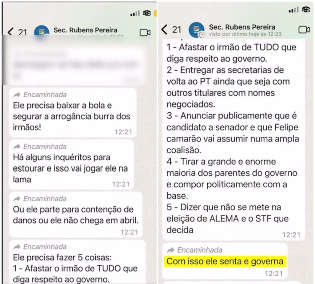 Nos prints divulgados pelo parlamentar, Rubens Pereira aparece encaminhando mensagens atribuídas ao desembargador. O conteúdo traria cinco exigências que deveriam ser cumpridas para garantir a “governabilidade” do grupo político de Brandão e evitar o seu afastamento.