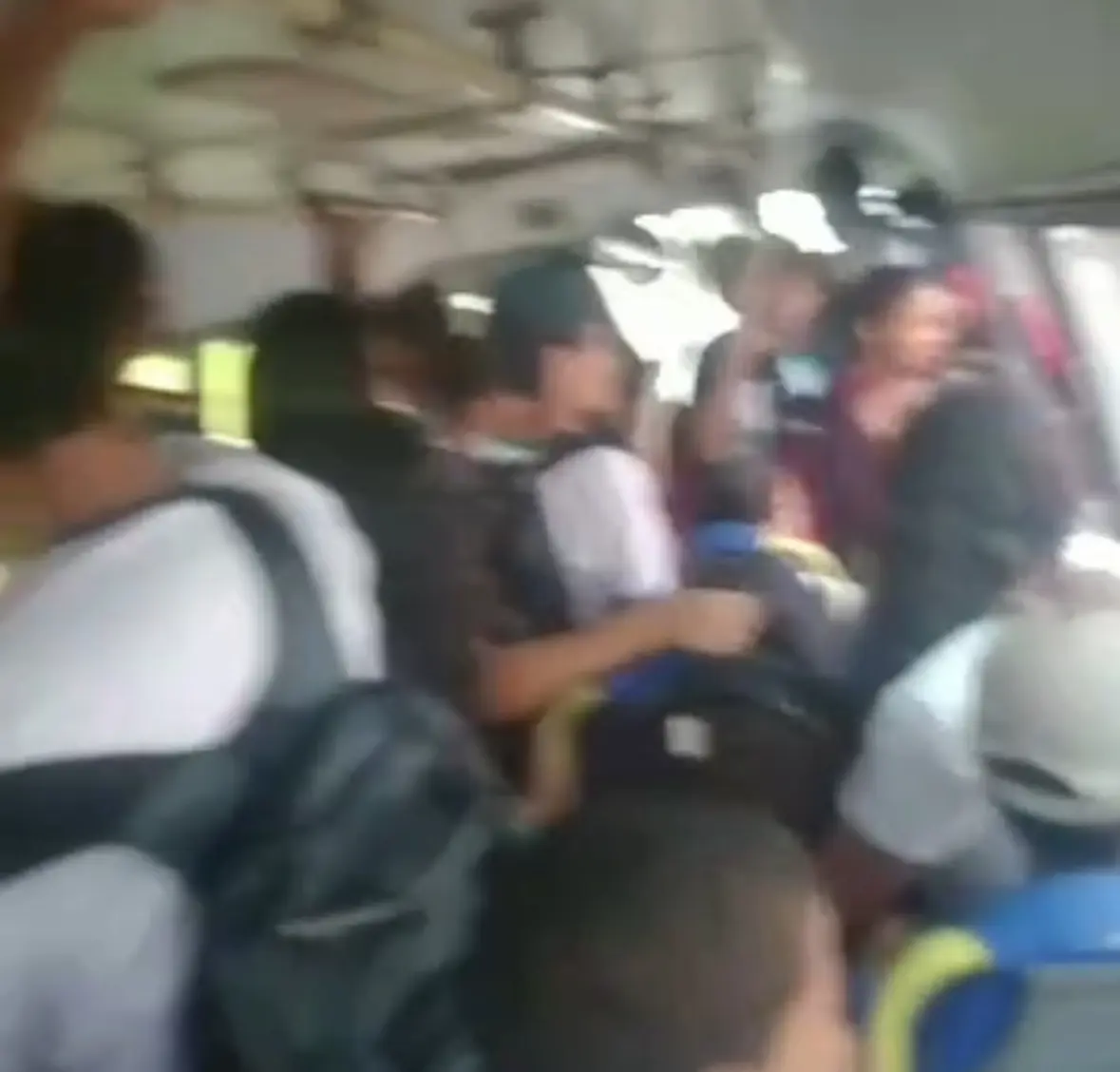 Em um vídeo, é possível observar um ônibus do transporte escolar, superlotado, e até mesmo com goteiras.