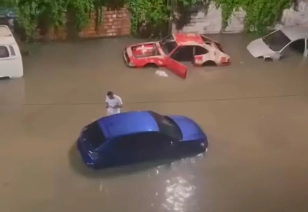 No bairro Vicente Fialho, um vídeo compartilhado nas redes sociais mostra um carro parado em meio à rua alagada, enquanto um homem ao lado usa o celular em um momento de desespero