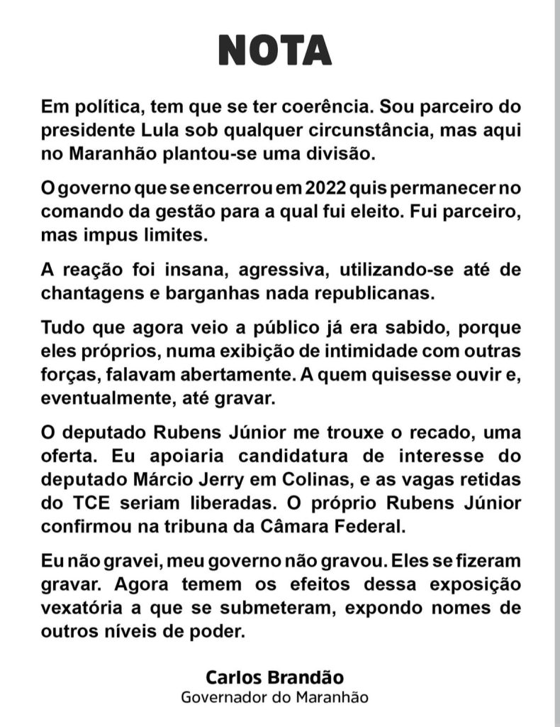 Carlos Brandão negou qualquer envolvimento na gravação dos áudios que vieram à tona recentemente. “Eu não gravei, meu governo não gravou. Eles se fizeram gravar”, afirmou. Ele concluiu a nota dizendo que os responsáveis agora “temem os efeitos dessa exposição vexatória a que se submeteram, expondo nomes de outros níveis de poder”.