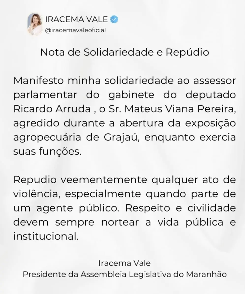 A presidente da Assembleia Legislativa do Maranhão, Iracema Vale (PSB), emitiu uma nota de solidariedade e repúdio, após o assessor parlamentar, Mateus Viana Pereira, ser agredido por aliados do prefeito Dr. Gilson Guerreiro, durante abertura da exposição agropecuária de Grajaú, neste sábado (19).