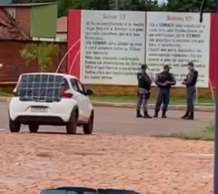 Sem viatura, guarnição da PM do Maranhão usa veículo improvisado, com plástico no vidro traseiro para evitar molhar