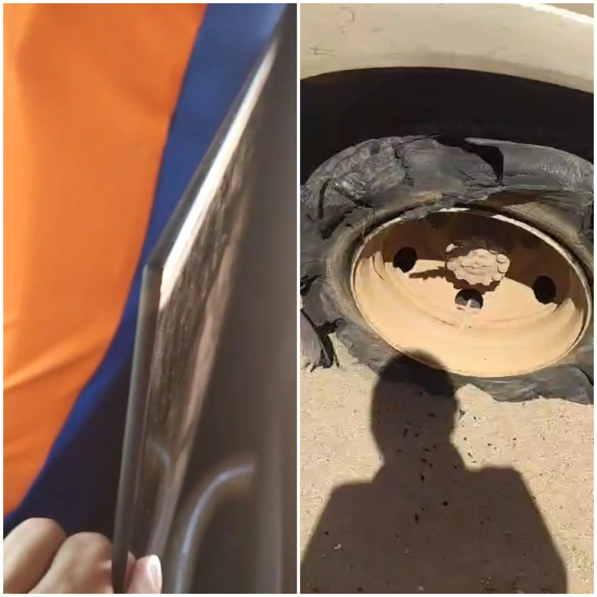 Em um vídeo divulgado nas redes sociais, é possível ver o pneu estourado e os pacientes reclamando do calor e da demora.